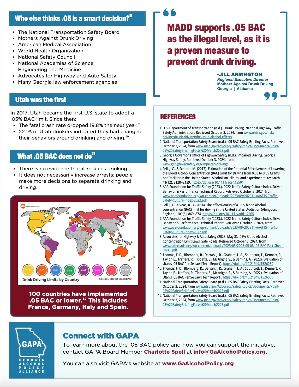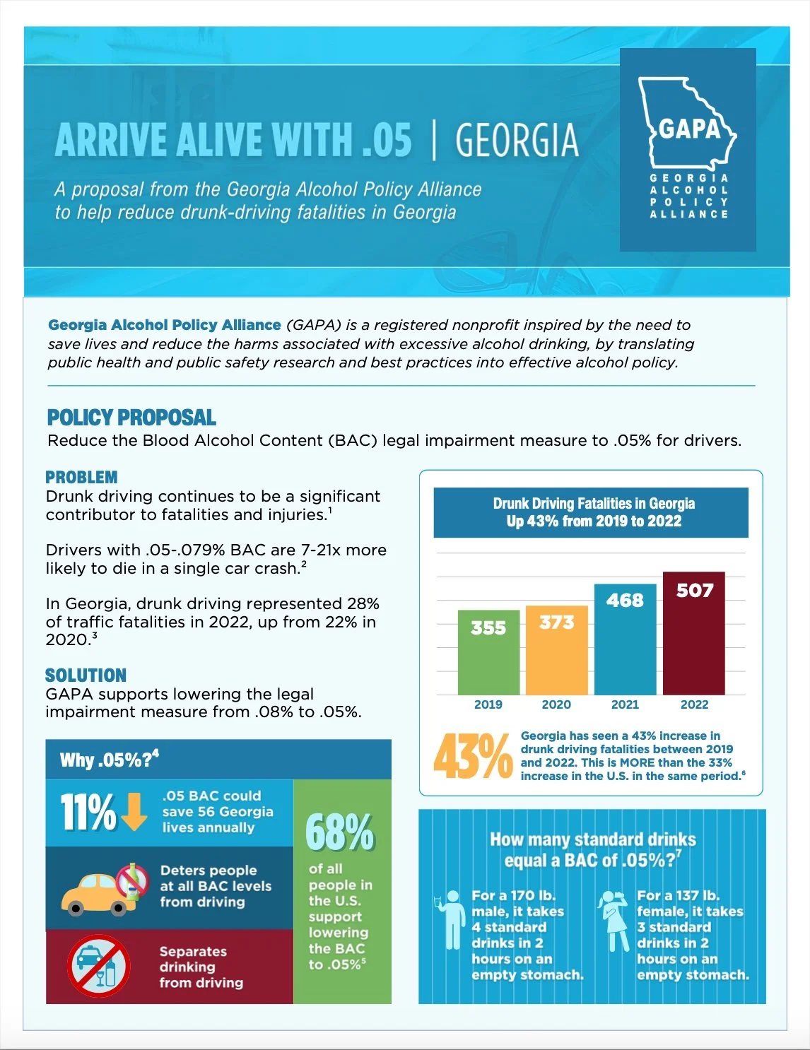 Special: Lowering the BAC GAPA supports lowering the legal measurement for alcohol impairment from .08% to .05% This will save lives, reduce injuries, and promote a safer and healthier environment for everyone. Check out GAPA's full proposal belowor DOWNLOAD PDF GAPA’S .05% BAC PROPOSAL